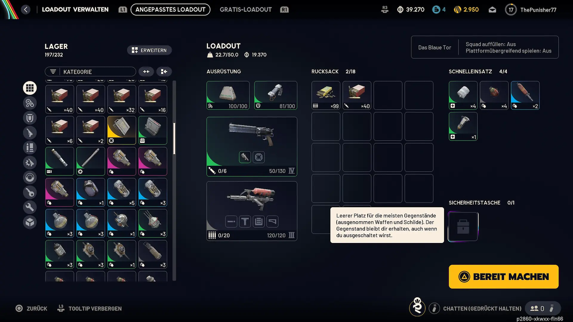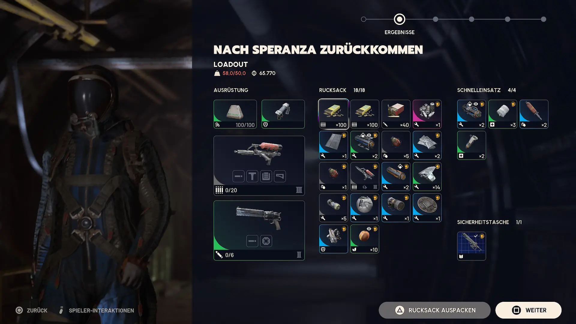 Das Inventarsystem sorgt für zusätzliche Spannung – aber auch Frust. Es ist alles künstlich begrenzt: begrenzte Slots, begrenzte Stapelgrößen, begrenzte Sicherheitstaschen (deren Inhalt man beim Tod behalten darf). Nur zwei Waffen gleichzeitig, dazu ein paar Gadgets, und schon ist der Rucksack voll. Natürlich kann man sein Lager und die Werkbank erweitern, aber selbst dann fühlt es sich nie wirklich nach genug Platz an. Ständig sortiert man, recycelt oder verkauft Dinge, von denen man weiß, dass man sie später wieder brauchen wird. Das streckt den Gameplay-Loop unnötig und unterbricht den Spielfluss.