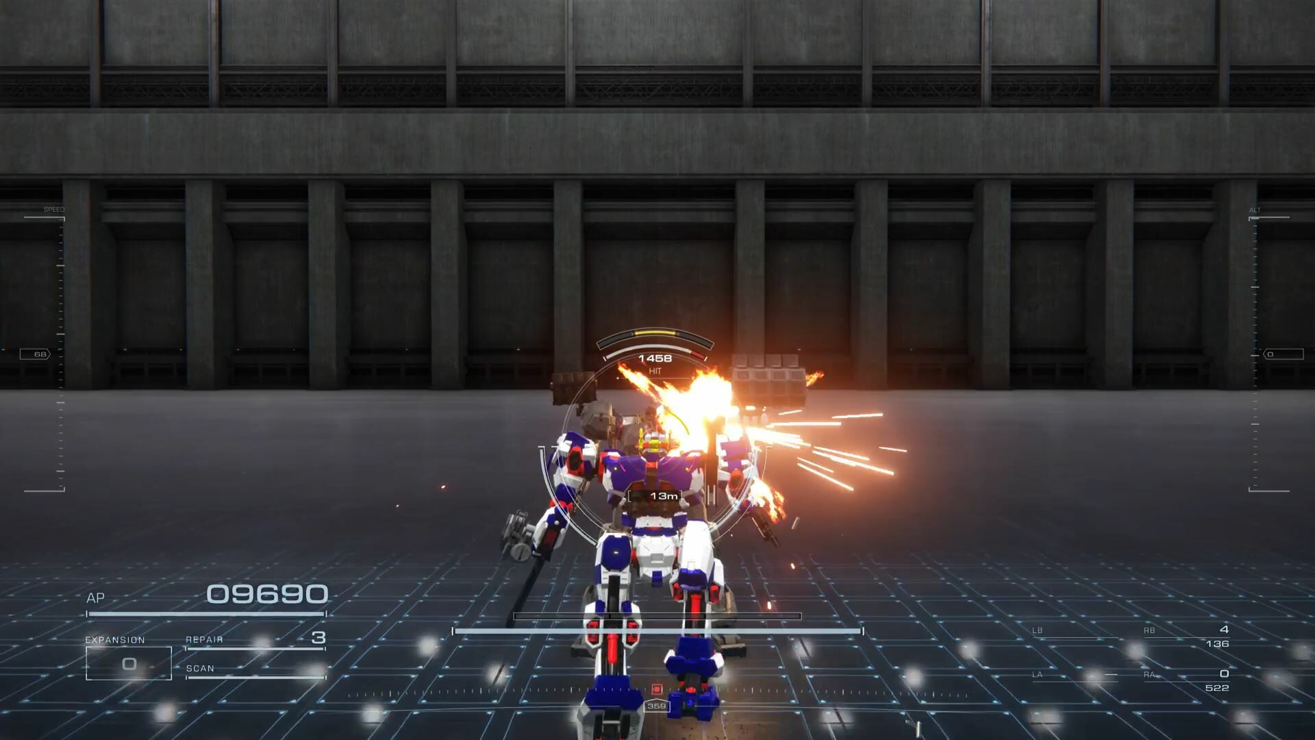 Souls Veteran Spieler erleben hier den Ursprung der altbekannten Steuerung. Denn seit jeher wurden die Schultertasten in Armored Core mit den Waffen bzw. Angriffen besetzt. Je nach der Ausrüstung der Mecha gibt es also bis zu vier verschiedene Aktionen. Mit dem linken Stick wird gesteuert und der rechte übernimmt wie immer die Kamera. Da es sich hier um ein fernkampfzentriertes Spiel handelt, wird eine weiche automatische Anvisierung angezeigt und Gegner, die näher in der Mitte sind, werden dann priorisiert. Mit der Kreis-Taste wird der Booster aktiviert und man schlittert dann mit höherer Geschwindigkeit durch die Gegend, bis man stoppt oder es deaktiviert, anstatt nur zu laufen. Hier muss ich aber zugeben, dass es umgekehrt besser gewesen wäre, denn es gab Momente, bei denen die langsame Bewegung zu unerwünschten Resultaten geführt hat. Mit der L3-Taste aktiviert sich der Assault Boost. Wer die Dragon Ball-Spiele kennt, der kann es mit dem Super Dash vergleichen. Man fliegt mit erhöhter Geschwindigkeit direkt Richtung Gegner oder Blickrichtung bei weicher Anvisierung und stärkt somit die Kampffähigkeiten aus mittlerer und naher Distanz. Die Dreieck-Taste ist doppelt belegt und wird für das Aktivieren von Objekten eingesetzt sowie für das manuelle Nachladen von Munition oder Abbruch einer Schuss-Aktion wie z.B. Aufladen oder Multi-Anvisierung. Die X-Taste ist für den Sprung reserviert, wobei die Auswahl der Beine einen riesigen Unterschied machen wird, weswegen wir später tiefer darauf eingehen. Später kommen noch weitere Funktionen hinzu, wie z.B. das frühzeitige Abwerfen einer Waffe oder die Aktivierung von besonderen Schildern.