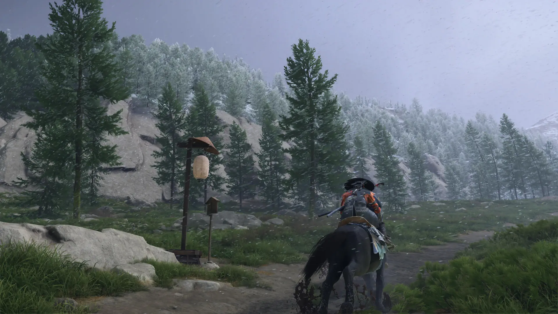 Selten macht eine Open World den Eindruck einer beeindruckenden atmosphärischen Weite und bietet dabei so viele Möglichkeiten. In Ghost of Yōtei ist die Landschaft Hokkaidos lebendig und dicht besiedelt mit Inhalten. Nebenquests reichen von emotionalen Geschichten über Dorfbewohner bis hin zu mystischen Begegnungen, die oft mit der Kultur und Geschichte der Region verknüpft sind, aber manchmal repetitiv wirken. Typische Aktivitäten umfassen das Befreien von Dörfern, das Sammeln von Ressourcen wie Bambus oder Blumen, das Erkunden von Schreinen und das Lösen kleiner Rätsel. Die Welt ist vollgepackt mit Aktivitäten, schafft es aber, ihre immersive Atmosphäre durch natürliche Hinweise wie Wind oder Skizzen beizubehalten.