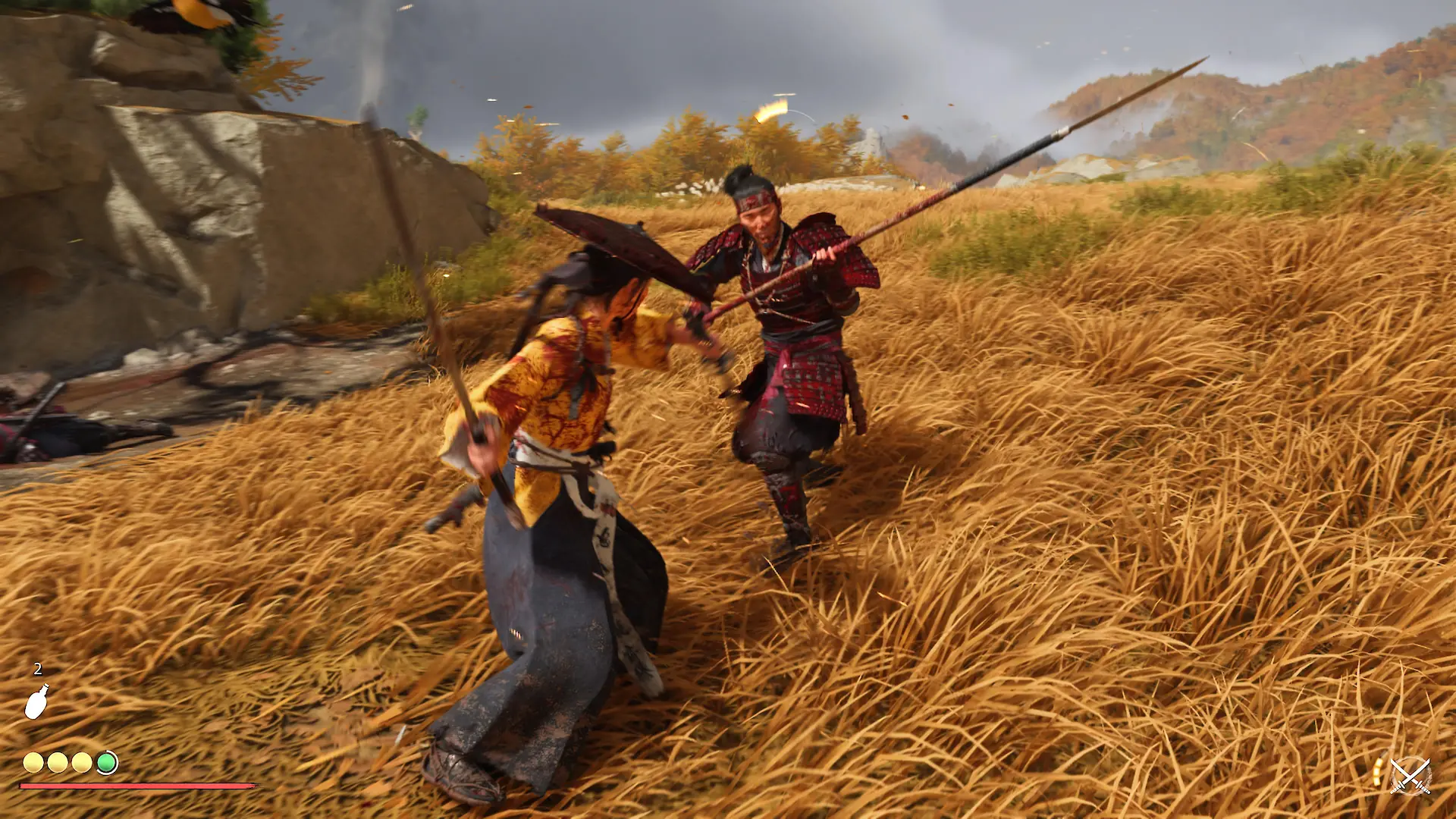 Neu ist auch das Kampfsystem: Während im ersten Teil verschiedene Haltungen eine Rolle spielten, dürft ihr nun verschiedene Waffen nutzen, um so gegen verschiedene Gegnertypen zu bestehen. Dabei kommt ein aufgeweichtes Schere-Stein-Papier-System zum Einsatz. Im Prinzip kann jede Waffe jeden Gegner besiegen, aber es gibt bestimmte Vorteile, die eingesetzt werden sollten. So ist ein Katana z. B. schlecht gegen große Gegner, aber effektiv gegen Katanas, während gegen große Gegner eher Ōdachi verwendet werden sollte. Dies ist nur ein Beispiel, wichtig ist es, sich im Kampf auf die verschiedenen Gegner einzustellen, um nicht in einen Nachteil zu kommen. Die Kämpfe sind dabei flüssig und visuell beeindruckend, es wirkt teilweise wie eine Film-Choreografie. Dabei bieten Umgebungseinflüsse, wie z. B. kaltes Wetter, sowie Stealth-Optionen Abwechslung.