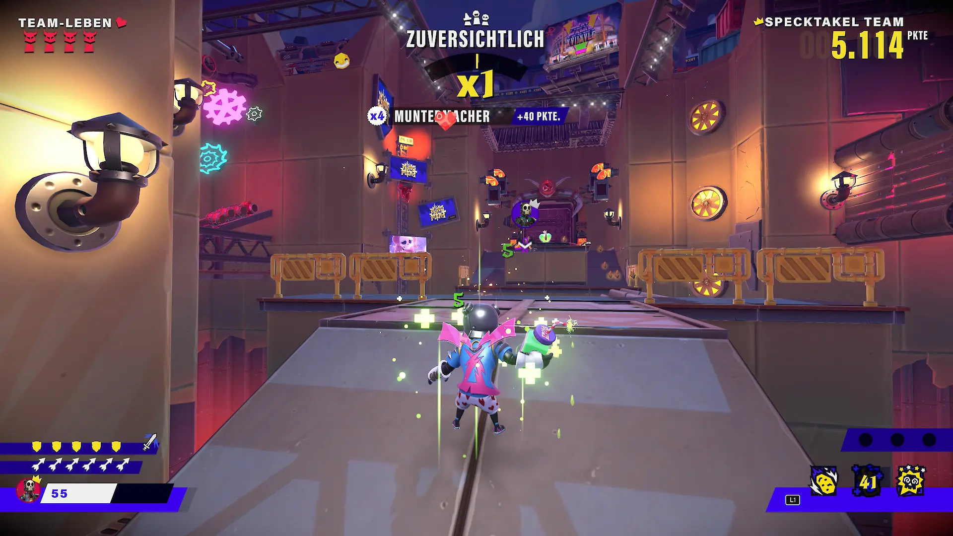 Das Belohnungssystem ist fair designt: Fast immer schaltest du etwas Neues frei, sei es eine Fähigkeit, ein kosmetisches Item oder ein Sponsor-Bonus. Diese Sponsoren bringen Witz und Satire ins Spiel, denn sie spiegeln die überdrehte Kommerzialisierung der TV-Show auf charmante Weise wider.