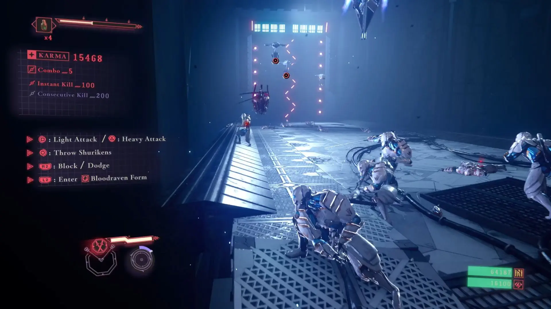 Auch hier wurde ein wenig gewerkelt. Neben Lebensenergie kann jetzt auch die Bloodraven-Forma Anzeige aufgeladen werden. Zusätzlich gibt es auch noch Gegenstände, die temporär die Angriffskraft oder die Verteidigung erhöhen. Sie erscheinen zwar minimal, doch bei Bosskämpfen kann das zusätzliche bisschen zwischen Sieg und Niederlage entscheiden.